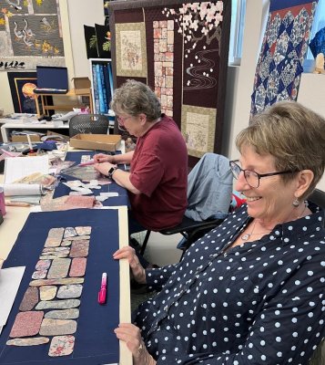 Learn how to form silk shapes using the Apliquick method and applique the shapes to a Japanese indigo background, creating a mosiac pathway.